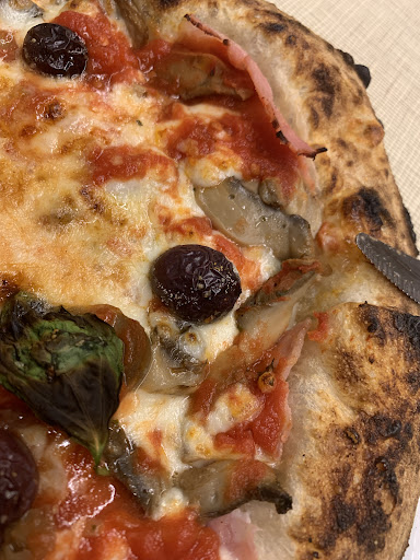 Die Pizza Capricciosa: Zuerst ein Auslieferungs-Versuch an Tisch 25. Nach kurzer Diskussion mit den Gästen und weiterem Servicepersonal, wird sie dann doch auf meinen Tisch (7) gestellt. Ich habe den Eindruck, dem Personal ist das Essen eher etwas peinlich. Kaum Augenkontakt. Minimalste Kommunikation. Die Pizza ist lieblos hergerichtet. Definitiv nichts fürs Auge. Mit schön breitem Rand (wer das mag). Die Zutaten sind in dem Durcheinander etwas schwierig zu identifizieren. Frische Pilze sehen aber definitiv anders aus. Auch hierzu das Foto beachten (zur eigenen Beurteilung). Niemals im Leben ist das alles so viel Geld wert. Auch wenn man die Preise halbieren würde, das Essen bleibt sehr mittelmässig.
