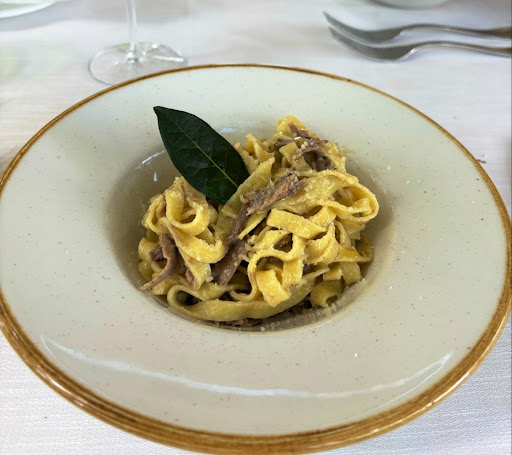 Read moreDi rientro da Roma verso Fabriano, visto l'approssimarsi dell'ora di pranzo, abbiamo deciso di modificare il percorso che il navigatore suggeriva lungo la E45 per Perugia deviando sulla direttrice Terni - Spoleto prevedendo di transitare in cima alla salita della Somma proprio per l'orario di apertura della Trattoria al Capanno di cui avevo sentito buone cose. Il ristorante, che in estate può vantare un notevole spazio esterno in mezzo al verde, ha un ingresso abbastanza ordinario mentre all'interno la sala molto ben organizzata intorno ad un grande camino con il cippo regolarmente acceso. Iniziamo subito un primo piatto che ci avevano decantato ovvero delle tagliatelle al ragù bianco di piccione, decisamente deliziose. A seguire, su suggerimento dell'oste, proseguiamo con due arrosti di spalla di maiale al finocchietto selvatico, contornato con patate cotte sotto la brace ed erbe di campo ripassate in padella. Porzioni generose al punto che resta solo il posto per un caffè. Soddisfatti chiediamo il conto e per errore ce ne viene portato quello di un altro tavolo di cui mi accorgo solo uscendo, dopo aver pagato il conto, notando il costo di una bottoglia di vino non consumata. Tornato indietro per segnalare l'errore il titolare si accorge che il conto è quello di un altro tavolo e chiedendo più volte scusa per il disguido procede con il ristorno della somma pagata e a stampare il conto corretto, 87 euro per due persone, direi in linea con la qualità del cibo e l'accoglienza del locale che fa parte del circuito delle Premiate Trattorie Italiane. Un locale dove certamente torneremo per provare altri piatti della sua cucina, non ultimi quelli al tartufo che fanno bella figura nel...