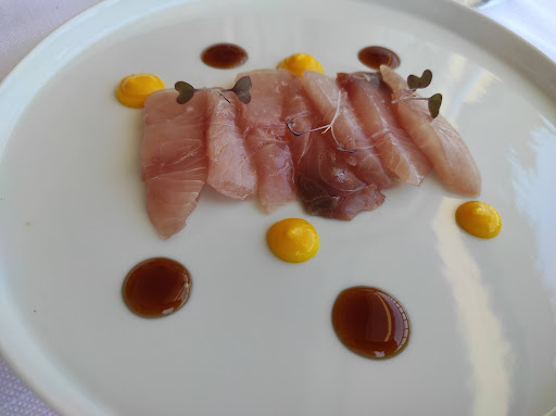Siamo stati in questo splendido ristorante per caso, mio fratello, mio marito ed io, in occasione del mio compleanno. L'accoglienza sensibile avviene nella sala antistante l'ingresso dell'hotel, con vista sulla terrazza sul mare e sull'isolotto di Bergeggi, che lasciano lasciano presagire un ottimo pasto. Siamo capitati nell'ultimo giorno del menù disponibile, perché dal 15 giugno ci saranno nuove "opere d'arte", vi spiego il perché: Una volta fatta l'ordinazione delle scelte (ognuno di noi avrebbe voluto assaggiare tutto) siamo stati accompagnati nell'attesa da un entreé della casa fuori menù, che cambia ogni giorno. Ho pubblicato diverse foto che meriterebbero una recensione speciale ciascuna, perché le persone che lavorano egregiamente e con evidente impegno in questo posto hanno scelto di unire la materia prima tipica della zona a km 0 con la creatività visiva e sensoriale del gusto. Si tratta di un ottimo ristorante gourmet da chef stellati, ma prezzi del tutto sostenibili! Tanto, che per la curiosità di scoprire il menù della sera, (che è diverso da quello del pranzo), siamo tornati a cena la sera stessa! E la conferma è arrivata: il connubio fra tradizione, passione, creatività e dedizione ai colori, nuovi abbinamenti e sperimentazioni ricercate del gusto sono esplose in armonia all'unisono nei piatti serviti durante una splendida alba lunare sul mare di Spotorno. Auguro ad ogni persona di vivere l'esperienza culinaria e sensoriale più azzeccata in tutta Liguria, che abbiamo vissuto noi! Bravi, bravi, bravissimi! Torneremo...