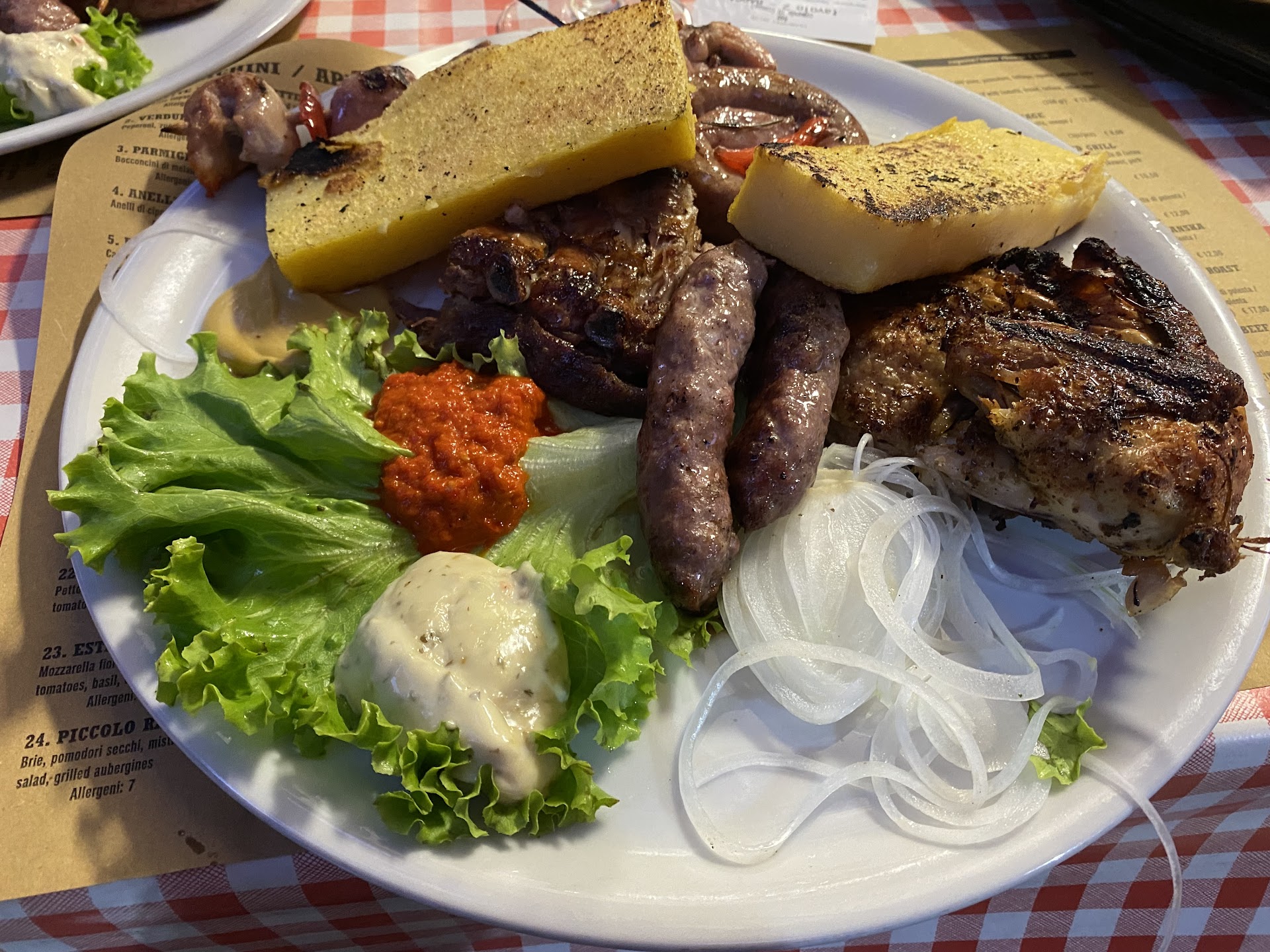 Read moreArrivati alle 21.15 in una serata particolare, sagra de le Raze a Staranzano, in cui non si trovava posto a sedere da nessuna parte ormai presi dallo sconforto e sulla strada per casa abbiamo provato a chiedere se c'era posto. Accolti cordialmente ci è stato fatto presente che c'era una mezz'ora da aspettare ma vista la situazione abbiamo accettato senza problemi. C'era il pieno di gente. Come da previsioni dopo un po più di mezz'oretta abbiamo mangiato ma il motivo c'è. Non esiste roba preparata e messa in stand by al caldo....fatto tutto express come dev'essere per una grigliata. Ordinato una porzione di patate, arrivate subito dopo il bere 😉 gran mossa per far passare il tempo visto che a tavola c'è un bambino. Griglia 🔝 anche lo spiedino che di solito risulta stopposo era super per non parlare della costa eccezionale. Abbondante, non quattro pezzi messi in croce. Un'ottima birra rossa ad accompagnare un'ottima mangiata. Finalmente un posto dove posso mangiare una grigliata quando non ho voglia di farla a casa. Due griglie Una rossa media Una bionda piccola Fanta Patatine 53€ e sconto di 3€ per l'attesa.Piacevole sorpresa. Bravi così si lavora Non consigliato ma...