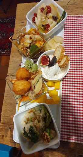 Read moreUna di quelle trattorie tipiche in zona che mi ero riservata di provare, essendo io un amante del baccalà! Piccola all'interno, una trentina di tavoli, arredata con un gusto dall'atmosfera familiare, sembra di entrare in un vecchio casale di campagna dove la zia ci attende per una cena tra amici. Ninnoli, suppellettili e vecchie foto alle pareti, tovaglie a quadri e tovaglioli infiocchettati, i piatti bianchi, candele, piantine e cuori sparsi sulle tavole, tutto preparato con cura. Tutto il personale è molto gentile, ci sediamo e ordiniamo da un menù rigorosamente a base di baccalà, dall'antipasto ai primi e poi ai secondi le proposte dello Shef (donna) sono varie. Alcuni piatti ricordano la tradizione altri sono più creativi come l'entrée offerta dalla casa; mousse di zucca con baccalà mantecato e melograno, Buonissima!!! Abbiamo proseguito poi gustando i piatti della tradizione accompagnati da un buon calice di vino bianco. Tutto buonissimo e ben presentato, anche il dolce; gelato di Pere e cannella. Mi riservo soltanto sul Baccalà alla Vicentina, unico neo, in quanto bello nell'aspetto, bene nella consistenza ma assolutamente insapore e desavio e da qui le mie 3 stelle! L'intenzione è quella di tornare ed assaggiare altre portate ma nel complesso, a mio modesto parere, direi che è una trattoria che merita una visita. Tornerò perché voglio ricredermi e perché sono certa che meriti un voto più alto! Intanto ringrazio e faccio i complimenti anche per...