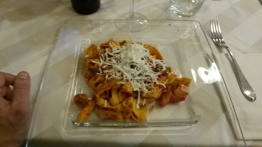 Il ristorante "Il Vecchio Muro" è un locale di gusto tradizionale, casereccio posto in una viuzza vicinissima al centro storico di Sulmona, ricavato dentro un edificio antico e con un ampio portico che, nelle giornate primaverili ed estive crea un atmosfera suggestiva. La cosa più impressionante sono i molti oggetti antichi di uso contadino appesi al muro di fianco l' ingresso della zona coperta del ristorante (ho notato una padella per castagne tra gli oggetti); un ristorante tradizionale che strizza l'occhio alla modernità 😉. Efficiente e accogliente il personale, sempre disponibile per qualunque evenienza, bravi! Devo ammettere che stavolta, per quanto riguarda il cibo, abbiamo un po' esagerato con le porzioni (perché ve lo garantisco, sono proprio abbondanti!) ma mangiarle è stato buonissimo: ci siamo presi un "trionfo" di antipasti, freschi e genuini: tagliere di salumi e formaggi, un piatto di frittura (pizzelle, arancini, supplì) e delle gustosissime lenticchie; interessanti le tagliatelle con funghi, macinato e panna che ho preso per primo, avevano un sapore intenso e dolciastro per via della panna, molto buono. Per gli gnocchi viola con burrata, invece, siamo rimasti perplessi: non erano male ma il sapore della burrata copriva.... Descrivendo il secondo lo definirei "un' esplosione di carne": l' arrosto misto era talmente abbondante che non siamo riusciti a finirlo; c' erano salsicce, agnello alla brace, maiale, patate al forno e una bella dose di spinaci, tutto delizioso, succulento e.....salato. Voto di consenso anche per lo stinco di maiale alla brace e il baccalà con ceci. Passato il secondo, ci siamo messi sui dolci o meglio, un dolce, visto che abbiamo preso tutti lo stesso: un cheesecake ai frutti di bosco, bello cremoso e artigianale. Terminato il pranzo con un buon caffè caldo e...... un piacevole e affascinante giro per il centro storico per...