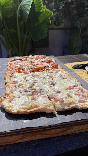 Viene servita su un vassoio di legno con carta forno, puoi ordinarne 1 metro (4 persone), 1/2 metro (2 persone) o 3/4 se alle due persone piace mangiare molto! È sottile ed estremamente leggera, noi abbiamo preso Cicoria/Salsiccia e Prosciutto crudo/Porcini, entrambe estremamente buone.