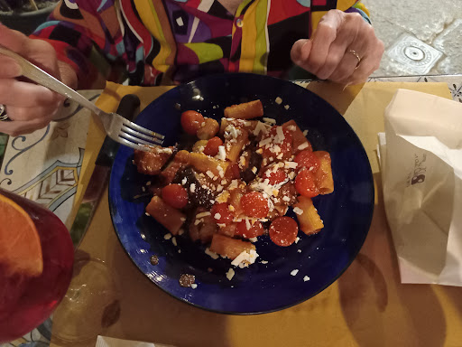 Lunch on Friday 17 May 2024. First time we have eaten here as previously it was very busy and is on the famous via Cavour, just before the main piazza and the cathedral. One bottle of water, one bottle of Segreta Rosso (Nero d'Avrola) at €19, one L'Oro di Sikelos (grilled aubergines and zucchini) at €5, one Filetti di Peperoni (Sicilian peppers) at €5, one Bietole Saltate (leafy greens called chard) at €5 and one Busciate con Crema di Ceci (pasta in a chick pea sauce) at €14 cost €50.50. No cover charge plus fantastic food...