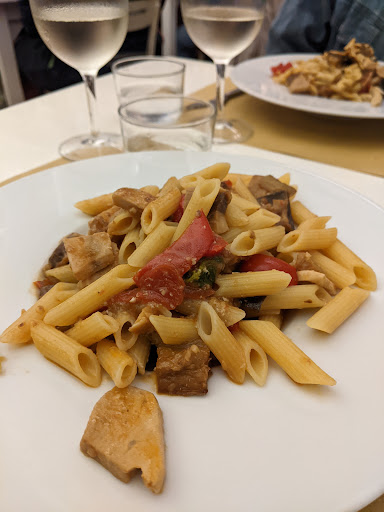 Piccola "Nota Dolente" il momento della scelta dei vini : abbiamo chiesto una lista, ma ci è stato detto che non c'era.. Un vero peccato, perché da fuori avevo fatto in tempo a notare un ampia scelta di bottiglie esposte su degli scaffali interni.. Personalmente non amo quando devo ordinare un vino senza poterne leggere le caratteristiche (se riportate) ed il prezzo, anche perché, salvo non si voglia badare a spese, si rischia di ordinare un vino con un importo superiore a ciò che si pensava o voleva spendere. Detto ciò, mi sono premunita di chiedere il prezzo dei 2 vini propostici dalla cameriera che gentilmente ce li ha comunicati, chiedendo però conferma ad un signore (credo il proprietario) che avvicinatosi ci tiene particolarmente a precisare che però tra i due vini c'era una differenza abissale di gusto (ma naturalmente anche di prezzo!).