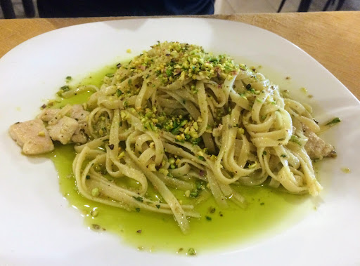 This is the first restaurant in Sicily that we felt that the pasta tasted not salty and light but still tasty. The pasta in squid ink was enough cooked and the sauce was excellent even without any fish meat. It tasted like black bean noodles (짜장면) or red bean soup (팥죽) from Korea. The pistachio fish pasta was nutty and rich in flavors. But, I wished both dishes had more seafood meat like squid on top of its nice sauce. The salad was simple and...