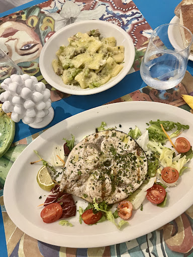Lunch on Friday 27 September 2024 We were welcomed by name and offered any table we wanted. We sat outside in the strong sunshine but we were protected by huge umbrellas and cooled by a brisk breeze. One bottle of water, two half litres of lovely white wine at €6 each, one amazing Burrata e Bietole (a soft Italian cheese with lots of leafy greens or chard) to share at €12 and two beautifully prepared Trancio di Spada (locally caught and freshly cooked swordfish = YUM) at €15...