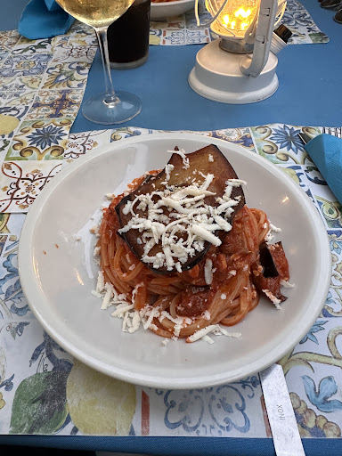 Dinner on Saturday 24 May 2025 Very windy today so the outside seating area was protected by very effective screens. One bottle of water, one half litre of good white wine at €6, one Caponata to share at €7, one Burrata e Bietole (with Mozzarella instead of Burrata as they had run out of Burrata) at €11 and one Pasta Maniace Completa (pasta with clams, spicy sauce and chard) at €18 cost €49.50. And we got a discount for being regulars. Again!