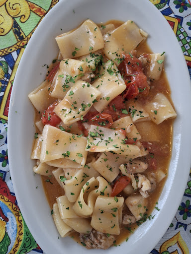 Lunch on Monday 30 September 2024 Our last lunch this Autumn and our fourth visit to this restaurant! One bottle of water, one half litre of lovely white wine at €6, one amazing Burrata e Bietole (a soft Italian cheese with lots of leafy greens or chard) to share at €12, one beautifully prepared large Trancio di Spada (locally caught and freshly cooked swordfish = YUM) at €21 and one Maniace alle Vongole Simplice at €17 cost €60. We chatted with the same (perhaps the only) waitress and amused each other with my Italian and her English! We did Italian kissing on the cheeks and promised to return in May next year.