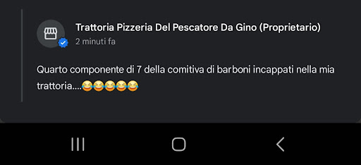 Ridicola risposta del proprietario (IN FOTO). Di fatto non ho detto che non era mangiabile ma che non era qualitativamente agli standard della cucina siciliana, una vergogna che lui possa spacci per ristoratore ed una vergogna che in sicilia esistano ancora queste realtà Cmq se non riuscite ad offrire mezzo amaro (non 7 ma 1) I pezzenti è evidente che non siamo noi. Grazie per la fantastica risposta è sempre un piacere leggere quanto in basso possa andare il...