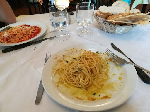 Read moreWir sind heute zufälligerweise an dem Restaurant vorbei gelaufen und fanden es von außen sehr ansprechend. Da es auch in unserem Reiseführer gelistet ist, haben wir es am Abend gleich ausprobiert. Wir wurden freundlich begrüßt und in die 1. Etage geführt. Dort standen ca. 10 bis 15 Tische, von denen eine halbe Stunde nach Eröffnung keiner belegt war (Sonntagabend). Der Speiseraum war optisch nicht sonderlich ansprechend, ansonsten aber in Ordnung. Wir haben jeweils Spaghetti (first dish) und Fleisch und Gemüse (second dish) bestellt. Die Speisen waren mittelmäßig und nicht sonderlich nett angerichtet. Es kam uns so vor, als wäre der Kellner nicht begeistert darüber, dass wir vorerst nur einen l Wasser bestellten, welcher in einer Plastik Flasche serviert wurde. Während der Mahlzeit schlängelte sich der Kellner an uns vorbei, um sich selbst ein Glas Wein einzuschenken und es auf ex runter zu kippen. Naja soweit so gut, wir sind in Italien. Dass er dann aber beim abräumen selbst das komplett vertrocknete Brot aß, welches noch in unserem Körbchen lag, machte keinen guten Eindruck auf uns. Dies wurde übrigens in einer Menge für 6 Personen und ohne Öl o.a serviert. Während wir aßen, stand der Kellner des Öfteren vor dem Getränke Kühlschrank und starrte uns an. Im Großem und Ganzem haben wir uns eher unwohl gefühlt und waren dann doch froh, als wir das Restaurant verlassen haben. In einer größeren Runde und kleinem Budget mag es in Ordnung sein, jedoch für einen gemütlichen Abend mit der...