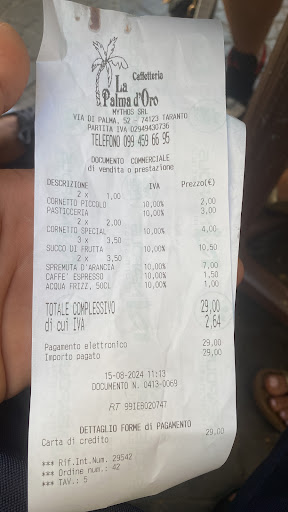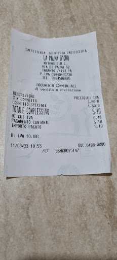 Read moreSalve a tutti..e' un po' di volte che frequento Ila palma doro bar pasticceria al centro di taranto .dove vivo..precedentemente frequentavo un altro bar ..la pasticceria il servizio del la palma doro sono eccellenti..Ma...il costo non è mai costante pagare x un caffè e cornetto è un altalena il prezzo varia a secondo dei giorni ..ho pagato 2€..2.20.€..fino ad oggi 2.50...x cui trovo questo mancanza di serietà nei confronti dei clienti...Mi dispiace non aver conservato gli scontrini come prova di ciò che affermò.. cmq lo farò prossimamente...buongiorno mi riallaccia a questa recensione scritta circa 10 giorni fa come promesso pubblico lo scontrino fiscale riguardante la consumazione di un caffè e un piccolo cornetto da notare che il caffè viene citato testualmente mentre il cornetto viene apostrofato tra varie ..ora x codesta consumazione il prezzo di euro..2.70 e fuori da mercato ricordo hai clienti attenti che la ristorazione ha ricevuto gran parte dei bonus anticrisi x cui non possono certo lamentare crisi..Io direi che vergogna è l'appellativo più valido grazie da un pensionato che 1 volta alla settimana si concede un...
