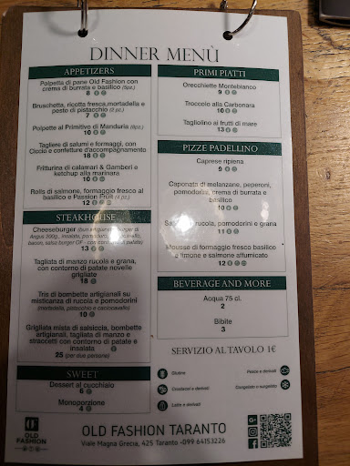 In una simpatica antitesi col proprio nome, l'Old Fashion ci ha abitati da sempre alla novità: ogni decade si rinnova, l'ultimo "vestito" è nel più attuale stile bakery/bistrot tanto di moda nel 2018 col suo connubio legno/nero. In questo, sempre primi a Taranto. AGGIORNAMENTO 30/07/2020: "Una squadra di giovanissimi ed appassionati professionisti". A dispetto del nome Old Fashion è sempre stato avanti ed ora il nuovo sguardo alla ristorazione ed al beverage di qualità è tangibile. Una squadra di giovanissimi ed appassionati professionisti che sanno accompagnarti in un'esperienza multisensoriale. Ho cenato 2 volte in 2 settimane trovando sempre piatti di mare freschi, ricercati ma non spinti ai limiti del gourmet fatto "per forza", che onestamente ha anche un po' stancato. Ad accompagnare questi cibi ottimi c'è la qualità di cocktails non comuni o addirittura personalizzati (vedi un Margarita rivisitato con soli prodotti italiani). Per tutto questo bisogna ringraziare il direttore di sala Luca, Enzo come responsabile del banco e bartender e lo chef Francesco, oltre a tutti gli altri dello staff tutti attenti e gentili ed ovviamente la proprietà. Il prezzo? Più basso della media ma con una qualità elevata, molto migliore rispetto a ristoranti più blasonati e modaioli che ormai dovrebbero pensare solo alla chiusura. Quando tornerò a Taranto sarà...