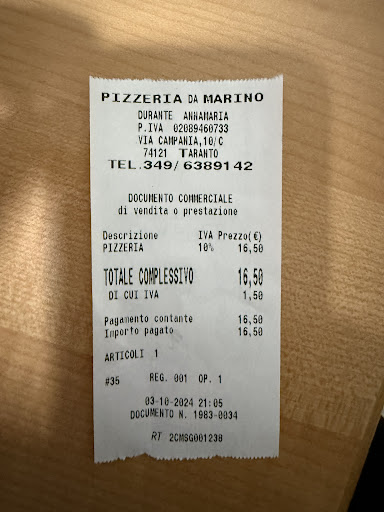 Ho appena ordinato due pizze di cui: una semplice margherita con patatine e una diavola con grana in cottura m, cipolla e qualche ma dico qualche spicchio di salsiccia fresca… due pizze al modico prezzo di 16,50… hanno giustificato che 2 euro sono d’asporto. Il tizio si presenta consegnandomi un biglietto scritto a penna e basta. Ho dovuto richiamare la pizzeria per farmi spiegare come mai due pizze avevano un costo esagerato e seconda cosa perché il tizio delle consegne non mi avesse consegnato lo scontrino fiscale, loro hanno giustificato il prezzo della 2ª pizza dicendo che costava 10 euro… cioè 10 euro come se stessimo mangiando in una pizzeria gourmet e per lo scontrino si è giustificato dicendo che il tizio si era dimenticato e che lo avrebbe fatto ritornare…. Dimenticare uno scontrino fiscale mah…. Roba da pazzi. A Paolo VI salinella e tamburi con questo importo prendi sicuramente una pizza in più.