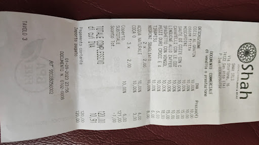 Read moreSiamo stati da Shah Restaurant & Bar in Viale del Tramonto (Taranto) la sera del 28 giugno per celebrare il nostro anniversario di nozze, e l’esperienza è stata memorabile sin dall’arrivo. Accoglienza e servizio ‑ Il personale si è dimostrato gentile, professionale e attento, contribuendo a farci sentire a nostro agio con discrezione e cortesia. Atmosfera ‑ Luci soffuse, musica di sottofondo discreta e una vista incantevole sul mare al tramonto creano un ambiente romantico e rilassato. Nonostante il vento della serata, siamo stati bene grazie a un’organizzazione attenta che ha saputo garantire comfort e piacevolezza. Cucina ‑ La proposta gastronomica si muove tra tradizione e creatività, con grande attenzione alla qualità degli ingredienti. Sublime il sauté di cozze, un antipasto che unisce sapore e raffinatezza. A seguire, un ottimo arrosto misto di mare, con cottura perfetta e pesce freschissimo. Carta dei vini ‑ Selezione ampia e ben calibrata sui piatti. Il cameriere ci ha consigliato un bianco pugliese che si è rivelato un abbinamento azzeccato. Rapporto qualità‑prezzo ‑ In linea con la qualità dell’esperienza: non economico, ma corretto per ingredienti, servizio attento e location. In sintesi Shah Restaurant & Bar si è rivelato il posto giusto per un’occasione importante: atmosfera romantica, cucina di livello e servizio che fa sentire coccolati. Torneremo volentieri per scoprire altre proposte del menu… magari al prossimo...