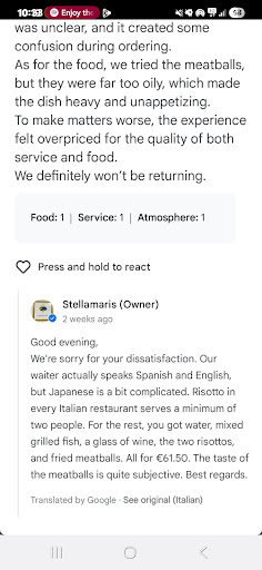 From the start, things felt wrong: when I went to the restroom, a waiter kept knocking on the door, which was intrusive and unnecessary. While we were still enjoying our cocktails and deciding on food, both the waiter and the owner kept pressuring us to order, as if they were in a rush to turn the table.