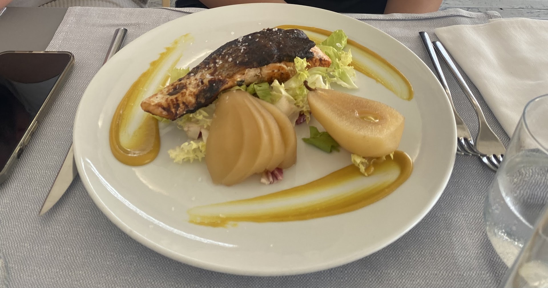 Außer unserem war nur ein anderer Tisch besetzt bei dem die Gäste bereits beim Essen waren. Trotzdem mussten wir auf den Lachs, die Nudeln und die Pommes eine gute halbe Stunde warten…