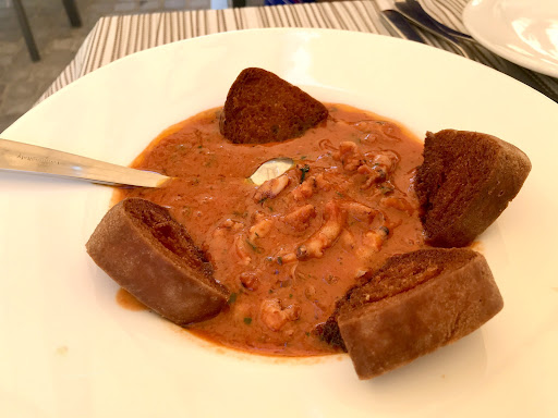 Well, we were right to walk past the restaurant wherever everyone else was crowded in and going a few more paces to L’Alberata. The signora who waited on our table was delightful even before she suggested the local white wine, which is amazing. Everything here sis amazing, including the house appetizer (a beautiful platter of eggplant with fish, octopus, fried cake of fish, and a couple of other items) and the main courses which included my risotto alla pescatora and my travel mate’s grilled octopus. I feel like we should come here every night that...