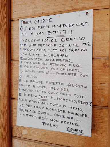 Troverai invece la genuinità del proprietario Bruno (chiamato anche: orso Bruno) che in modo molto schietto rude ma sincero ti mette a disposizione ciò che sa meglio fare, coi tempi giusti che richiedono le cose buone e belle a prezzi onesti come una volta... Il telefono non prende, ma non ne sentirai la mancanza. Da Bruno è un ritrovo di amici e di gente del posto che sa come funziona da lui, e non rompe le palle, aspetta e si gode il panorama, il vino, la compagnia..anche il suo cane Ares è burbero come il padrone :D