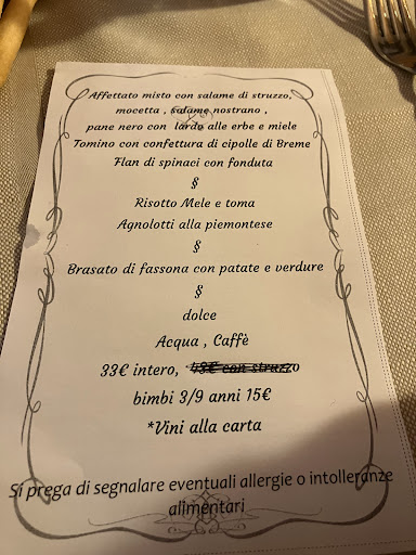 Read moreSiamo passati una domenica a pranzo prenotando con poco anticipo, ci accolgono: siamo una coppia e un cagnolone. Ci fanno accomodare in una delle due salette della zona ristorante, ambiente caldo e accogliente senza troppi fronzoli. I tavoli si riempiono nel giro di poco. 4 portate di antipasti eccellenti, dal salame di struzzo al tomino fresco alle castagne bollite con burro e miele. Materie prime di indiscutibile primissima qualità. Passiamo ai primi piatti: risotto ai funghi dal sapore squisito (forse leggermente troppo al dente) e agnolotti buonissimi e secondo di struzzo alla griglia e arrosto di vitello. Il tutto accompagnato da vino della casa di buonissima qualità, acqua e grissini piemontesi. A conclusione panna cotta ai mirtilli (fatta in casa) e torta di mele. Due grappe e due caffè. 68€ totali! Rapporto qualità prezzo più che ottimo, soprattutto per la zona. L unica pecca potrebbe essere il servizio particolarmente lento, sennonché il personale è così disponibile e cordiale che ti fa passare L ansia di andare di...
