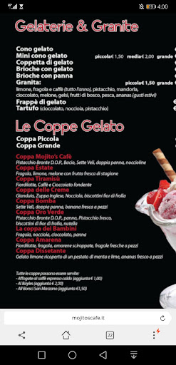 Read moreAbbiamo ordinato 5 coppe e 1 granita alla fragola, alle 22 di sera a metà settimana, ma dopo aver ordinato, e dopo circa 15 minuti abbiamo ricevuto le 5 coppe, ma la granita era stranamente esaurita, e il locale era vuoto. È stato sgradevole poichè avrebbero dovuto farci sapere immediatamente della granita esaurito. Altro problema, la coppa oro verde ha come descrizione "Nutella" ma non fatevi illusioni, perchè non è nutella ne una pallina di gelato, ma una semplice "glassa, strisciolina di cioccolato" sopra il biscotto. Non è quello che ho ordinato, e quando ho chiesto il perchè non ci fosse della Nutella, mi sono sentito rispondere "la Nutella è solo sul biscotto", ma l'altra cosa che non mi ha fatto piacere, è che questa "Nutella" c'è su tutte le coppe, ma nel menu non è specificato. Di conseguenza ho lasciato la mia coppa senza finirla, nonostante il pistacchio fosse buono. Non credo tornerò a Mojito, finché non risolveranno...
