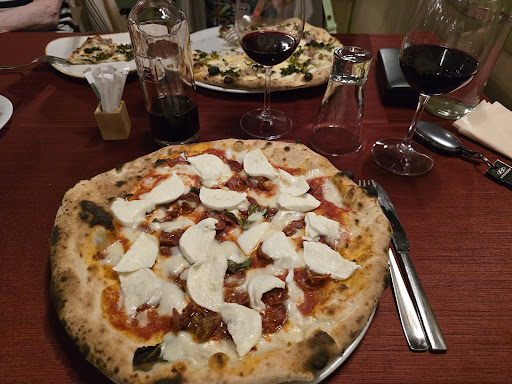 Pizzeria La Gioconda in stile rustico con due sale e molti tavoli. Abbiamo prenotato di Sabato per 4 persone alle ore 21:40, dopo 5 minuti d'attesa ci hanno dato un tavolo con tovaglia di stoffa e tovaglioli di carta. Menù già pronti sul tavolo. Abbiamo ordinato una pizza porca vacca € 9,50, una salsiccia e patate € 9,00, una diavola € 8,00, una margherita € 6,50 e 1 litro di birra € 10,00 un litro d' acqua € 2,50. Tempo d'attesa 15 minuti. Le pizze più grandi dei piatti di portata erano cotte alla perfezione con buone materie prime, molto gustose e digeribili. Successivamente abbiamo ordinato due dessert artigianali Bindi. 1 profiterol € 4,50, 1 tartufo al cocco con nocciole € 5,00 duro come una pietra. Con i coperti speso € 63,50. Servizio veloce, gentile e professionale nonostante la grande affluenza di gente. Scarsi i dessert a prezzo esagerato. Pagato con carta di credito. Parcheggio esterno libero. Per accedere al locale bisigna scendere delle scale e questo inibisce l'ingresso in sedia a rotelle. Zona periferica nei pressi dell'Ospedale ben collegata e scarsamente...