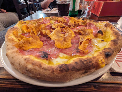 Read more4 stelle solo perché era sabato, tanta tanta gente, locale pieno, attesa pizza poco più di un'ora ma ne valsa la pena. Ottima pizza a legna, eccellente l'impasto leggera fatta di farine scelte di prima qualità, si esce senza quella pesantezza di aver mangiato. Ottimo anche gli ingredienti della pizza che rimane sottile al centro e più alta ai lati. Menù Pizze speciali solo durante la settimana, veramente invitanti. Buone le patatine con la buccia servite su un vaso di latta con carta old e direi abbondanti per una persona. Ottima anche la birra, rigorosamente alla spina e una scelta che vanno soprattutto su birre tedesche come la Paulaner sia rossa che weiss e la classica bionda sempre tedesca lowenbrau. Dolci fatti in casa ma non provati. Bellissima location stile retrò sia all'interno rinnovato nello stile sia in veranda, alla ricerca dei dettagli con effetti luce con lampadine a sospensione stile vintage a filamento e vari oggetti appesi sempre vintage. Peccato essersi ritrovato a pagare il coperto x quattro...