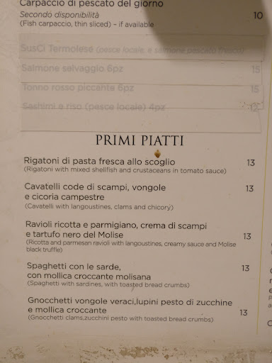 We ate at this restaurant several nights ago and enjoyed it but only partly. First the positive aspects: the place itself is small and cozy, the service was impeccable and friendly, the wine (a rosato from Molise) was splendid. The appetizers were absolutely wonderful. I had the raw antipasti platter which was fresh, flavorful and beautifully presented. My husband had the cooked antipasti which were inventive and served in two sequences of three, 6 delectable dishes in all.