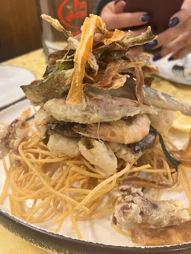 It looks unassuming from the outside but upon going in we were greeted with a smile and we felt a homely atmosphere right away. Free water (both still and sparkling) were provided to us upon arrival, then some bread, and to my surprise, free prosecco as well! It only got better from here. We had the fish tempura and the polpo with pear to start. Then for mains we had the cacio e pepe served in a pecorino basket, matriciana di mare, spaghetti with fresh anchovies and pecorino cheese and frittura mista. For dessert we had the mille foglie and the meringue. Everything was amazing, the quality of the food and presentation was incredible and the service was friendly and attentive.
