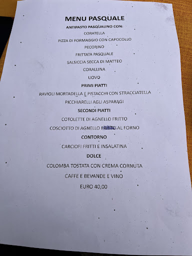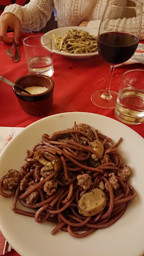 Locale piccolino e senza pretese: una ventina di coperti all'esterno, arredamento in plastica, nessun abbellimento, apparecchiatura al minimo sindacale, tovaglia di carta fermata al tavolo con delle mollette da biancheria. Una trattoria insomma alla buona, forse troppo; di certo storica, visto che è attiva dal 1947, sempre a conduzione familiare. Menu abbastanza ampio, grande scelta per carnivori, poca per vegetariani/vegani, no pesce. La cucina è al livello dell'ambiente: porzioni e cotture come a casa, abbondanti e semplici. Non si può pretendere di più vista la location e la gestione, ma é un peccato; basterebbe pochissimo per migliorare molto. 3.5 il voto complessivo anche considerando la modica spesa, assolutamente giusta: un quarto di vino bianco, un'acqua naturale, pappardelle al cinghiale (pasta non fresca fatta a mano), tagliatelle al tartufo (pasta anche questa non fatta in casa, tartufo locale ma anche questo commerciale), patate arrosto, hamburger di angus con patatine fritte...