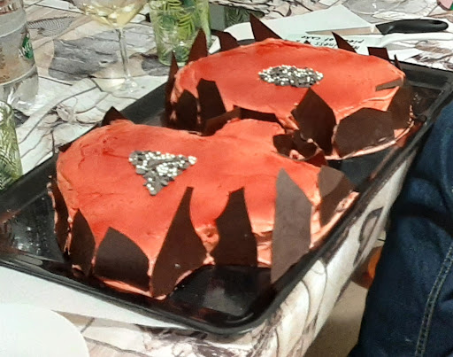 Così, dopo aver ceduto alla tanto onesta quanto imbarazzante scarsa professionalità e preparazione sia tecnica che commerciale, ho ordinato un 40 in pan di spagna al cioccolato fondente ripieno di crema bianca con gocce di cioccolato e arachidi all'interno, e copertura di crema al burro color rosso acceso senza alcun inserto.
