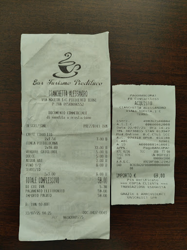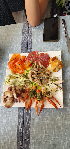 Read moreLocale con pochi tavoli ma curato e carino, con quel tocco di azzurro che crea una bella atmosfera. A Piedilugo volevo provare piatti di lago e così è stato! Non sono un amante del pesce d'acqua dolce ma ho trovato I piatti curati, ben impiantati e di personalità nei sapori. Cantina con pochi vini locali, consiglierei di ampliare la scelta. Il bar offre un bel banco di prodotti e una gelateria di qualità. Piccolo neo che vorrei segnalare ai proprietari per migliorare il loro locale: il vino viene stampato al tavolo e lasciato lì dalla ragazza; fatelo versare, assaggiare ed attendete l'ok per servirlo. Inoltre nel bell'antipasto mare e lago ci sono molte varietà di pesce preparate in vari modi ma se al servizio non mi si spiega cosa c'è nel piatto io non so cosa sto mangiando anche perché non è scritto nemmeno sul menù. Ma come dicevo, piccoli nei che se migliorati consentiranno al cliente di godere meglio del servizio e del pasto. Comunque,...