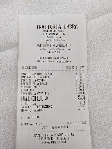 Read moreEX “DA CARLINO”. Su consiglio di un amico del luogo, con pochissimo tempo a disposizione per la pausa pranzo, andiamo a degustare qualche delizia locale in questo locale che oggi si chiama Trattoria Umbra, ma che in realtà è la continuazione del locale storico TRATTORIA DA CARLINO che si trovava a pochi metri di distanza. Dispone di spazi sia all’interno che all’esterno, locale molto spartano ma … una carbonara da sogno!!! Uno di noi ha ordinato la trippa e ne ho assaggiata una forchettata (perché contrariamente alla trippa lombarda, che è “brodosa”, qui viene servita asciutta)… una squisitezza!!!! Purtroppo avevamo pochissimo tempo, e dovevamo scappare per un appuntamento di lavoro, quindi abbiamo potuto deliziarci solo di un piatto a testa, ma … inutile dirlo … ci torneremo senza ombra di dubbio!!! Non so dare indicazione sul prezzo perché eravamo ospiti, ma credo sia in linea con i prezzi del...