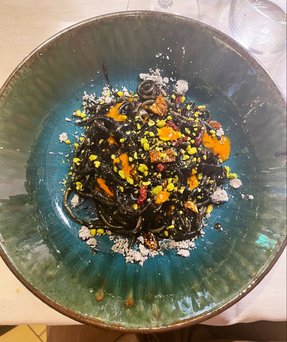 Buon pranzo a base di pesce nel centro di Terracina. Con la mia famiglia abbiamo scelto il ristorante più rinomato del posto per gustarci del buon pesce, e ne siamo rimasti mediamente soddisfatti. Come antipasto ci ha colpito la zuppa di cozze e vongole, molto buona, mentre il polpo su crema di patate non ci ha entusiasmato per la porzione molto piccola e il gusto non molto deciso. Le ostriche erano discrete. La pasta alla vengole ottima, piena di vongole e cotta a puntino, al contrario gli strozzapreti polpo olive scarola purtroppo sembrava non contenessero pesce, sarà il sapore troppo forte delle olive e della scarola? Il polpo non era ben valorizzato. Lo spaghetto al nero di seppia in foto era molto buono, la porzione se pur sembra piccola, l’ho trovata perfetta. L’unica pecca a mio parere è la scelta di aggiungere quella riduzione di pomodoro e quella polvere di spirulina(mi sembra), entrambe non menzionate sul menù, sarà il tocco dello chef? Per fortuna sapori non molto forti, anzi era come se non li avesse messi. La frittura è sicuramente la cosa più buona che ricordo di quel pranzo, leggera, croccante, oserei direi veramente impeccabile, tornerei solo per quella. Il dolce in foto, cupoletta di cioccolato ripiena di zabaglione, non ci ha fatto il giusto effetto di “finale in bellezza”. Il servizio è più o meno buono, la location è carina, forse un pó troppe tende limitano la luminosità che viene dalle vetrate, costringendo a tenere tante lucine accese, una per ogni tavolo. La cosa che mi ha più colpito è il sicuramente il conto, non in modo positivo. I prezzi sono veramente molto molto alti, un quartino di Pinot Grigio di una cantina normale non viene a costare così tanto, ne a te ristorante ne al pubblico. La frittura per questo speciale sia stata, una porzione come quella in foto, mi sembra spropositato farla pagare 24€. Questa è la prima volta che ho pagato il servizio a percentuale, 15€ per un servizio discreto, non molto fluido, in cui il personale in formazione, giustamente, non sa ancora trattare il cliente adeguatamente. Tra l’altro, soldi che non premiano il servizio del personale, i camerieri, ma che vanno diretti nelle tasche dei proprietari. Le mie aspettative erano diverse, non è stato un pranzo memorabile, se non fosse per il conto e...