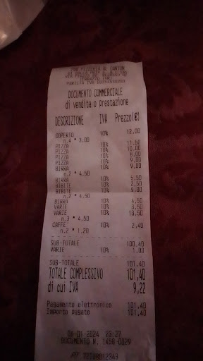 Read moreÈ vergognoso non andate a questo locale quando organizzano delle serata…!!! 4 pizze un paio di birre 4 dolci 100 euro…!!!! Il coperto 12 euro e uno scandalo … Per non parlare del titolare del locale che fuma dietro al Bancone del Bar Essendo anche dei bambini nel locale ..!! Non aggiungo altro. Cercate altro Non ve lo...