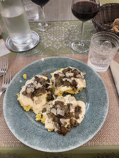 Ordiniamo una pasta al pomodoro, leggermente al dente, per il bimbo, un crostone di polenta con fonduta e funghi, buono, ma non era un crostone, la Tartare di carne salada, a tratti non morbidissima, dei ravioli caserecci con sugo di brasato gustosi e delle costine di cervo in umido con polenta e frutti rossi, troppo salate e troppo cotte. 2 bocce di acqua e caffè offerto dalla Titolare.