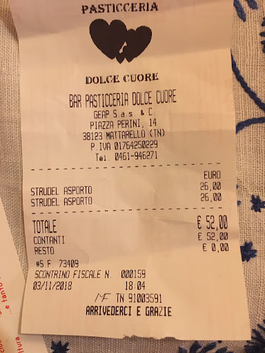 Read moreLo strudel più caro del Trentino! Se potessi dare 0 stelle lo farei. Questa recensione è valida per lo Strudel e non per il resto, tuttavia ognuno poi faccia le sue valutazioni. Come si può chiedere 26,00 euro per uno strudel da asporto? tanto più che la pasta non è neanche quella originale. Ne ho assaggiati di strudel e a prezzi decisamente più bassi. Io consiglio vivamente di non acquistarli in questa pasticceria perchè davvero ne trovati di molto più buoni e molto meno cari! Ho anche scritto per avere dei chiarimenti ma non ho...