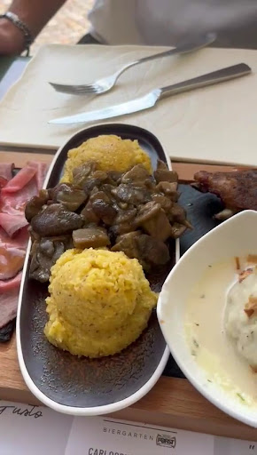 Cena idilliaca! Il ristorante offre un ampio parcheggio in modo da non preoccuparsi di trovare un posto auto. Avevamo prenotato e ci hanno fatto accomodare. Il ristorante offre solo posti all'esterno dato che è aperto esclusivamente nei mesi estivi. L'ambiente è assai elegante e romantico, in particolare con il calare del sole le luci illuminano il locale e la vista dall'alto sulla città è suggestiva. I giovani camerieri sono stati gentilissimi, disponibili e professionali, inoltre l'ottimo servizio è stata garantito dalla serietà del personale e dalla quantità di dipendenti in modo da evitare lunghe attese. Appena seduti ci hanno portato due salse, del pane e dei bretzel caldi. Dopo aver chiesto del pane senza glutine mi hanno servito un piattino con una pagnotta calda e soffice. Abbiamo cominciato con un tagliere XL, già abbondante e adatto per 3-4 persone. Abbiamo richiesto anche i tortel di patate e senza che chiedessimo qualcosa loro hanno avuto l'accortezza di servirci dei tortel senza glutine. In seguito abbiamo ordinato il piatto del mastro birraio, è suggerito per due persone, ma dopo l'antipasto è stata una sfida finire il piatto e sarebbe stato adatto anche per tre persone. Nel nostro gruppo è stato ordinato anche il galletto che nonostante fosse per una persona in realtà avrebbe saziato due persone. La qualità dei piatti è elevata ed è possibile gustare la vera cucina tipica trentina, dagli antipasti agli amari. Consiglio vivamente la carne perché è il loro punto forte, ma in caso di vegetariani allora raccomando i primi piatti. Alla fine abbiamo assaggiato l'amaro e ci hanno lasciato una bustina di carta perché ti riporti il bicchierino a casa, un'idea davvero carina. Inoltre vorrei gli stessi piatti nella mia futura casa, sono incantevoli. È stato tutto perfetto, abbiamo trascorso una serata incantevole, ci tornerei più che volentieri. Se volete fare una bella figura con il/la vostro/a partner, la vostra famiglia o degli amici ( ancora meglio se non sono trentini) questo è sicuramente il posto adatto. Complimenti a tutti i dipendenti, non potevamo...