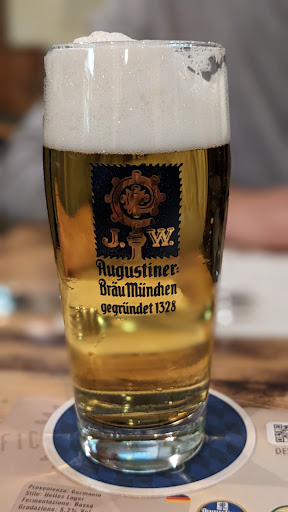Starting with Coperto bread being superb in quality! A good collection of beer, the menu includes Augustiner helles, pils, dunkel, Schneider Weiss original and aventinus and many others. A very beautiful spacious building. Nice, friendly staff (not strange in Italy anyway). Food: I ordered a Bufala Pizza, but it was a bit different from what I have had in other places (I expected something simpler than this). Nevertheless, it was rich in ingredients with fresh buffalo mozzarella on the pizza. There was an interesting pub quiz competition going on on a projector screen with a mobile based answering system. It was funny because the guy who won the game had used the nickname "Rex Erection" 🤣