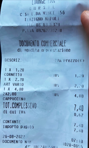 Read moreSembrava un bar carino dove sostare per un velocissimo aperitivo, io e il mio ragazzo abbiamo preso un the diviso in due poiché era quasi ora di pranzo e abbiamo chiesto un po’ di stuzzicheria (ci hanno portato dei semplici rusticini). Il prezzo ci ha lasciato un po’ con l’amaro in bocca poiché abbiamo speso 7€. Considerando che in altri bar questi soldi li spendi per 2 the e portano la stuzzicheria compresa mi è sembrato un tantino eccessivo. Inoltre non hanno fatto neanche lo scontrino, questo è ancora più grave. Prima e ultima...