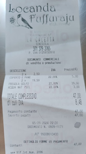 Read moreIl locale è una locanda, come dice il nome, quindi l'arredamento è rustico e simpatico. Tuttavia, volevo segnalare che, anche se non si tratta di un locale "elegante", con camerieri con guanti bianchi che ti servono il vino appena il bicchiere è vuoto, questo locale meriterebbe stelle Michelin. Si tratta di uno dei luoghi dove ho mangiato il miglior pesce della mia vita, non solo per la qualità del prodotto ma anche per cottura, ricette tradizionali, abilità dello chef. Fantastico il polpo, il tonno appena scottato, un meraviglioso pesce spada. Il mio compagno ha mangiato i primi e conferma l'opinione. Anche le patate fritte erano eccezionali: tagliate in modo particolare e fritte con la buccia: divorate. Ho assagiato anche la carne, anche se di solito evito, ma volevo provare tutto. Ottima cottura. Ho assaggiato il vino rosso della casa, e la pompia, un amaro fatto con un agrume che cresce solo nella zona della Caletta (Nuoro), preparato dallo stesso Stefano, simpaticissimo padrone del Fuffuraraju. Il rapporto qualità prezzo è ottimo. È il locale dove abbiamo mangiato meglio e speso meno di tutta La Caletta. Secondo me, vale la pena di fare visita a Stefano, il Fuffuraraju, anche se trascorrete le vostre vacanze a qualche chilometro da...
