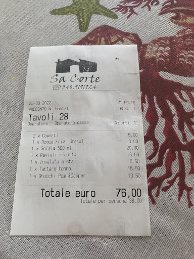 [secondo commento - 2 settembre 2025]: Mi trovo costretto a riscrivere su questo ristorante, o meglio, sul ristoratore, dopo la sua insultante risposta. Da ingenuo pensavo che avrei ricevuto una semplice nota di scuse per il disguido e speravo di non perdere tempo così… sarà almeno una storia curiosa da raccontare, a fine di una vacanza bellissima, a parte questo risibile episodio. Un paio commenti ed un ringraziamento: invito tutti a leggere le passate risposte di questo ristoratore a qualsiasi review negativa. Ci sono persone che accettano le critiche per migliorarsi continuamente. E altre no, senza rendersi conto che nella ristorazione attaccare così un cliente non è la miglior difesa. Tacciare di spilorceria per non aver preso una seconda bottiglia d’acqua da €3 quando si e’ appena speso €54 per due scampi, senza neanche controllare dove il cliente ha mangiato e pubblicamente recensito nell’ultima settimana, e’ sciocco. Pensare che su un conto di €149 il sovrapprezzo di €10 (dopo avere ricevuto da parte della cameriera assicurazione che non sarebbe stato applicato, visti i nostri ordini), sia un problema di soldi, significa che non si è proprio capito il problema. Chiunque può vedere le mie recenti recensioni in ristoranti chiaramente migliori per qualità e servizio, inclusi 3 raccomandati dalla guida Michelin. Se in questa estate “Sa Corte” di Santa Lucia è stato l’UNICO ristorante con recensione negativa su NOVE recensiti (a tutti gli altri ho dato tra l’altro 5 stelle), un po’ di autocritica un ristoratore accorto forse se la farebbe. Oppure no, continuiamo ad attaccare i clienti che “vorrebbero ma non possono” Utilizzare lo stereotipo del bambino piccolo che disturba e sporca (“abbiamo dovuto disinfettare a fondo le sedie in pelle”…veramente?) e’…puerile. Nostra figlia è riconosciuta da tutti come una bimba molto educata e rispettosa, oramai abituata a mangiare fuori. Ringraziamento: dopo l’esperienza di ieri, mi sono finalmente deciso di andare in una nota pescheria ad Orosei dove per 8 scampi (per carità, più piccoli 😌), un gran bel filetto di tonno e 10 succose ostriche di Tortoli’ ho speso quanto per i due scampi a Sa Corte, dove sono proposti a €160 al kilo, sicuramente di primissima e inarrivabile qualità, ma pesati da un signore che certo non brilla sempre...