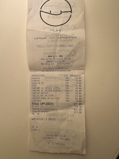 Read moreSiamo andati in questo posto ( io e la mia ragazza ) pensando di provare un’esperienza culinaria , ma non é stato così , almeno per gusti personali. In sala c’è una persona che , accoglie , serve , e fa il conto. In cucina c’è lo chef , un ragazzo giovane. Ordiniamo 2 tartare di “Grigia” alpina ( che correttamente sarebbe “Grigio”alpina la razza). La tartare viene servita a pezzi grandi almeno 2,5/3 cm circa , e non come una normale tartare battuta al coltello più fine . Ma questa é la proposta di questo ristorante. Veniamo ai tasti dolenti , la mia ragazza ordina una costata ,io dei tagliolini al tartufo. Il tartufo era privo di gusto , e nella pasta c’erano circa 15 gr ,(questo a detta dello chef)che si dovevano far sentire tutti . In un piatto come i tagliolini al burro e tartufo quest’ultimo dovrebbe far da padrone come gusto , invece era quasi inesistente . La costata , appena arrivata al tavolo ,aveva proprio odore di agnello ( da capra). Non lo era troppo al gusto ma l’odore di agnello al naso era molto forte , e posso immaginare ( non con certezza) fosse stata cotta nello stesso posto dell’agnello dato che era nel menu anche quella fatalità . Ma lo chef smentisce a riguardo. Ordino una bottiglia di trebbiano di Emidio Pepe che in carta era 2020 e la cameriera si presenta con la 2021 , ma va be dico che non c’è nessun problema . Un piattino di cicoria 8 euro Sulla mia tartare mi é stato chiesto se desideravo sopra del tartufo, non dicendo che era a parte e che avesse il suo prezzo separato e mi é stato pure messo in conto .