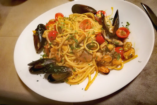 Die Antipasti waren einigermaßen schnell serviert und bestanden überwiegend aus Schinken und Salami. Das Brot zu den Antipasti waren kleine und leider sehr trockene Brötchen. Anschließend kamen die Pasta und als diese aufgegessen waren dann auch die Pizza. Bei der Pizza war dermaßen viel Tomatensoße drauf, dass der dünne Boden leider dadurch total aufgeweicht war. Das war bislang die schlechteste Pizza im Ort. Da schmeckt sogar die Pizza im Hotelrestaurant besser.