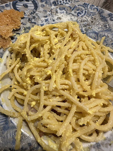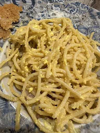 I wouldn't recommend it even to my enemies. I should have called the carabinieri for such poorly cooked pasta carbonara. The correct name should have been spaghetti omelette. I think the waiters also have a responsibility when they bring absolutely pathetic dishes to the table. The waiter kept repeating to me that it was carbonara... Ok mate.