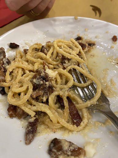 Read moreSiamo arrivati in questo locale molto carino con l’aspettativa di sentirci a casa, ma purtroppo è accaduto l’opposto. Dopo averci fatto accomodare ci è stato subito detto che ci sarebbe voluto un po’ di tempo. Eravamo affamati e ormai seduti, quindi abbiamo deciso di aspettare. Peccato che siano passati quasi quaranta minuti prima che venisse presa la nostra ordinazione: un tagliere di salumi e formaggi, un piatto di porchetta alla “romana”, due pizze fritte cacio e pepe, due carbonara, due cacio e pepe, due bottiglie d’acqua, un quartino di vino e una birra piccola. Già questo ritardo ci aveva lasciato perplessi, ma essendo domenica a pranzo lo abbiamo considerato comprensibile. Dopo la prima mezz’ora di ulteriore attesa, però, non arrivava nulla. Abbiamo chiesto del pane, ma la richiesta è stata ignorata per ben tre volte. Alla quarta, una cameriera si è scusata, e solo a quel punto è intervenuta quella che suppongo fosse la co-proprietaria portandoci il pane con un commento davvero fuori luogo: “vabbè, vi avevamo detto che avreste aspettato”. Alla mia risposta “sì, ma del semplice pane lo abbiamo chiesto 20 minuti fa”, invece di scusarsi ha replicato con tono seccato: “evidentemente le ragazze erano impegnate”. Impegnate con cosa, resta un mistero: in sala eravamo al massimo una ventina di persone. Quando finalmente è arrivato il tagliere, si è rivelato piuttosto deludente: due sole fette di mortadella, due tipi di formaggio e abbondanza di prosciutto crudo e cotto. La porchetta, a mio avviso asciutta, è piaciuta solo ad alcuni dei miei amici. Dopo un’ulteriore mezz’ora sono arrivati i primi: la carbonara con pasta ancora cruda e una “carbocrema” ridotta a un grumo di formaggio e uova; la cacio e pepe invece molto buona, peccato che ormai la fame fosse svanita. A fine pasto abbiamo chiesto il conto. È arrivato quello che credo fosse il proprietario, che si è “scusato” nascondendosi dietro un detto romano stampato sul retro del menù: un’uscita evitabile quanto le altre.In conclusione, la prima esperienza non è stata positiva. Una delle cameriere ci ha invitato a tornare in settimana per un servizio più tranquillo: vedremo. Per ora, l’unico vero ringraziamento va alla...
