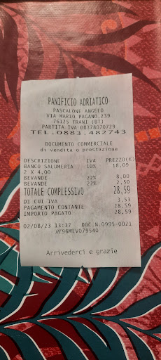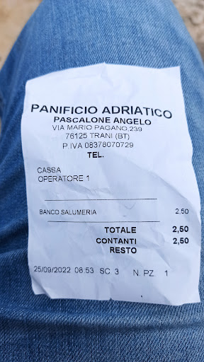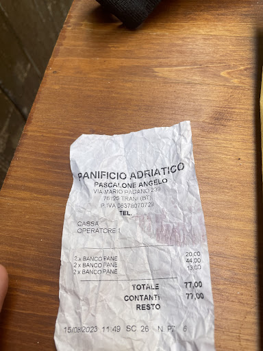 Read more2 focacce ,2 calzoni e 2 bustine di taralli 77€ complimenti ai grandiosi chef del panifico Adriatico ….neanche la focaccia di chef Cannavacciolo mi è costata tanto …ps ho trovato dei diamanti e qualche pepita di Platino in un calzone esperienza ottima per non tornarci più…ah dimenticavo peccato che non si può fare un commento senza stelle perché non ne meritano manco mezza