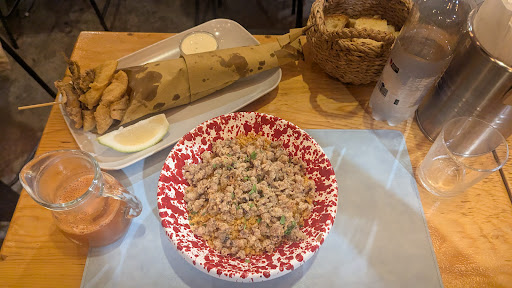 This busy, award-winning eatery specialises in all things seafood. Unsure of the portions, I ordered both seafood cous cous (€10) and Místo Egadi (also €10), a mix of fried calamari, cod and sardines. And let me tell you - it's a lot. if you want to eat sea food with no frills attached, you are in the right place. The cous cous came with the broth in a separate jug so you can dose it at your leisure. The dish was very nice - not exceptional (maybe due to the size and fried nature of the seafood involved, because the cous cous itself was immaculate) but hearthy and homely nonetheless. The fried seafood however was great and the bread and the sauce that came with it worked wonders. So if you dying for fish and chips or some fried fare, this will hit the spot. And at this price point you will have trouble finding anything near as good. The staff are pretty nice and seem to run the place very efficiently.