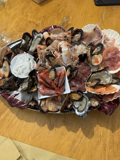 Read moreLocation carina,non molto preparati a serate di pioggia (si rischia di mangiare sotto l'acqua). Una volta seduti ( 2 adulti e 3 bambini) dopo almeno 15 minuti abbiamo dovuto chiedere i menu, una volta ordinato tutti abbiamo chiesto di fare arrivare il cibo ai bambini insieme ai nostri antipasti e in una seconda parte i nostri primi. Arrivati dopo poco e una volta finito gli antipasti e i primi dei bimbi si è fermato tutto ..per avere altro pane per i bambini ci siamo sbracciati per circa 15 minuti con camerieri poco attenti e tra l'altro chiesto a 2 camerieri perché il primo ci ha risposto che lo avrebbe portato subito ma non lo ha mai fatto.... (Da precisare che il locale era mezzo vuoto per il mal tempo). Dopo 45 minuti di attesa, dopo che i nostri figli avevano finito di mangiare anche il secondo abbiamo chiesto dove fossero finiti i nostri primi..RISPOSTA: scusate ma ci siamo sbagliati e li abbiamo portati ad un'altra tavolo, è successo anche con questo tavolo accanto..scusateci tanto!. Arrivati i nostri cavatelli ai frutti di mare, che di frutti di mare in un posto di mare non avevano nulla tranne che 4 gamberetti minuscoli e surgelati...speravamo che fosse finito il calvario. Chiesto i dolci ,i miei figli chiedono lo stesso dolce e ci dicono che c'enera solo uno...almeno l'amaro potevano offrirlo! Vi consiglio di comprare pesce alle pescherie e...