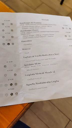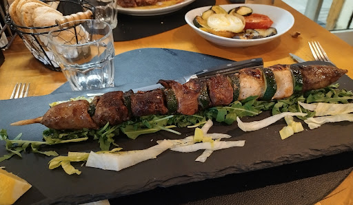 L'antipasto comprendeva vari affettati, torta al testo, 4 crostoni (uno solo olio, uno con pomodoro, uno con patè e uno con del formaggio fuso) e salsiccia secca. Tutto molto buono anche se mi aspettavo anche qualche formaggio. La grigliata tutto sommato non era male, anche se alcuni pezzi erano un po' secchi. Le patate arrosto molto buone. La peculiarità di questo locale inoltre, è che non si viene serviti al tavolo ma viene dato un dischetto che suona quando il piatto è pronto e bisogna andare a recuperare il cibo vicino...